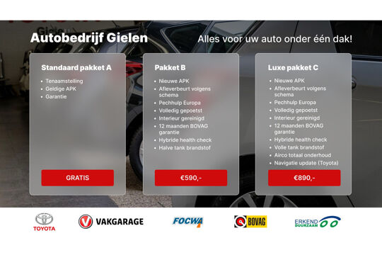 Optioneel kunt u kiezen voor het luxe pakket C. Voor slechts €890,- wordt de auto voorzien van een nieuwe APK keuring, een afleverbeurt volgens schema, een Airco onderhoudsbeurt, een hybride Health Check, een volle tank brandstof, Navigatie update (Toyota) en een jaar lang pechhulp Europa. Tevens wordt de auto volledig gepoetst en gereinigd.